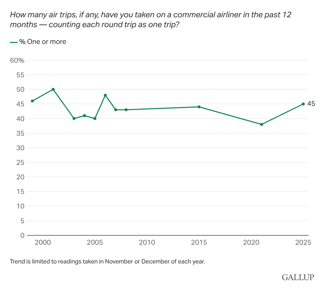 Los datos: El cuarenta y cinco por ciento de los adultos estadounidenses dicen haber tomado al menos un vuelo comercial en el último año, volviendo esencialmente a la normalidad después del mínimo del 38% de la era de la pandemia en 2021.